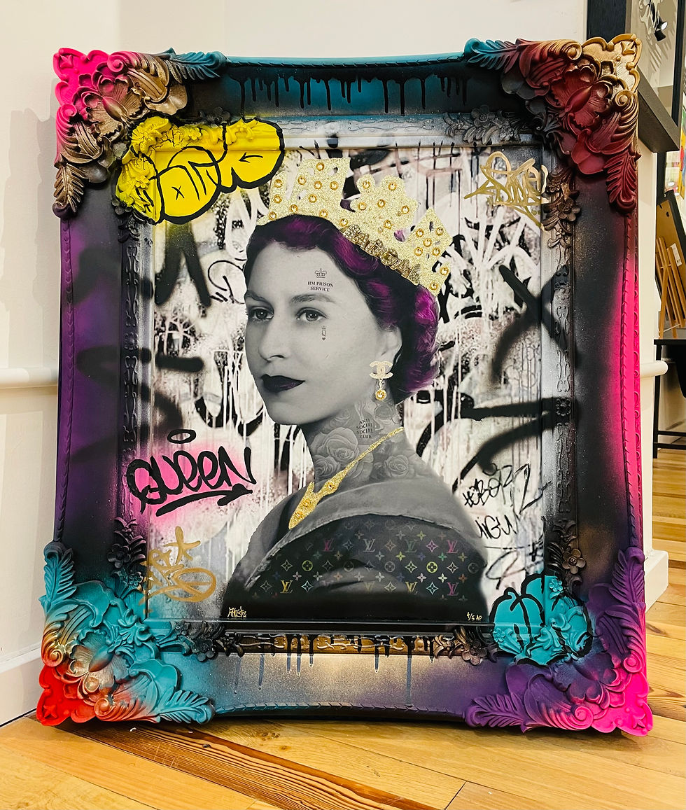 Ghost’s pieces are as layered in meaning as they are in material. Working with oil, spray paint, neon lighting, resin, and textiles, every work is constructed with intent, often reflecting the story or symbolism of the subject. Their limited editions are hand-embellished, ensuring no two pieces are ever the same.
