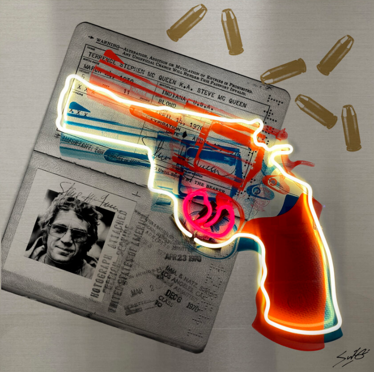 More recently Sidoli was the first artist to combine pop art portraiture with neon art. This resulted in several high profile exhibitions and in 2016, Sidoli presented a series of neon portraits at Halcyon Gallery, as a visual tribute to one of his key influences: David Bowie. The solo exhibition celebrated Bowie at the height of his artistic glory - his "Golden Years" from 1970 - 1980. Sidoli's signature technique of print and neon on aluminium provided the perfect medium for this subject matter, both for the neon 1970's vibe and the way it captures Bowie's kaleidoscopic and glamorous persona.