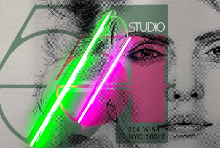 (L-R) 'The Godfather' Original Neon Artwork; Louis Sidoli, Richard & Sophie from Adamo Gallery; 'Studio 54' Original Neon Artwork; Client, Tim admiring Louis' work.