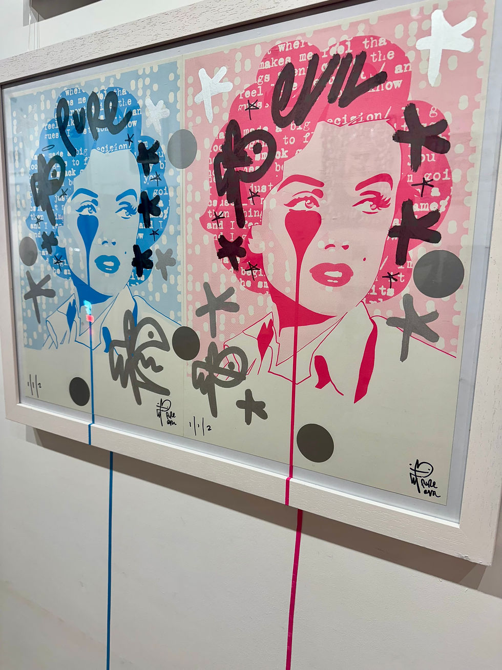 Heavily influenced by the Pop Art movement, Pure Evil is known for his Nightmare Series: doomed female icons, from Marilyn Monroe to Sharon Tate, are portrayed in Pop print colours, while a single, heavy tear (the artist’s trademark symbol) drips down their fated faces. A comment on the ills of celebrity culture, and the brutal realities of fandom and adulation, the instantly recognisable Nightmare Series has earned Pure Evil a well-deserved following in both Street and Contemporary Art circles.