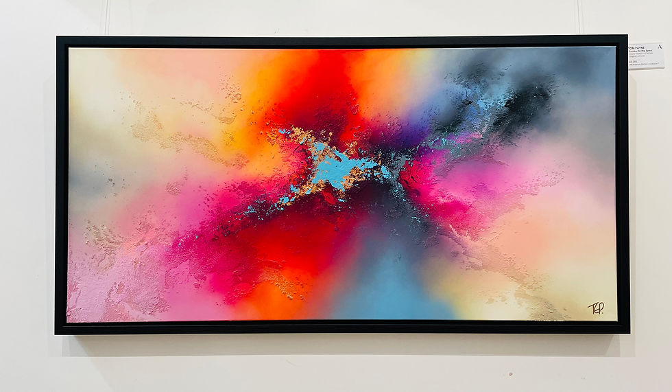 He uses texture to drum up atmosphere and drama in his pieces and focuses on bright contrasting colours, working to make them look like scenes from outer space or turbulent skyscapes and seascapes. Tom wants the viewer to connect with his paintings and enjoy what they see.